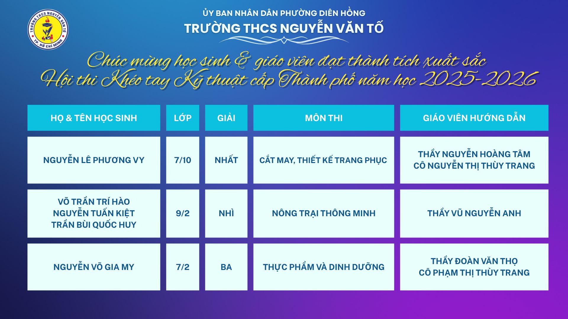 Trong không khí thi đua sôi nổi của năm học 2025–2026, Trường THCS Nguyễn Văn Tố hân hoan chúc mừng các em học sinh cùng quý thầy cô đã xuất sắc đạt thành tích cao tại Hội thi Khéo tay Kỹ thuật cấp Thành phố.