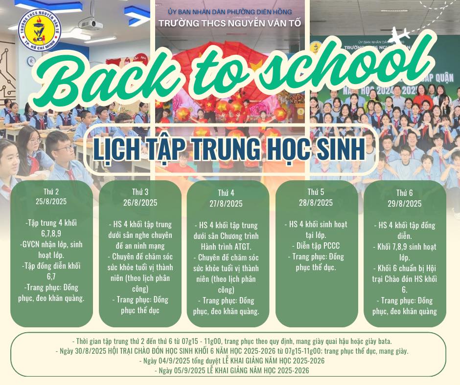 Chào đón các em trở lại mái trường Nguyễn Văn Tố với thật nhiều năng lượng, sự tự tin và quyết tâm mới. Cùng nhau, chúng ta sẽ viết tiếp một năm học đầy thành công và kỷ niệm đẹp!