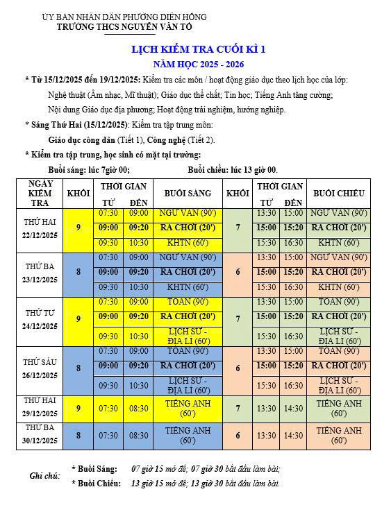 Thông báo Lịch kiểm tra cuối kì 1 năm học 2025 - 2026 Ngày xuất bản: 08/12/2025 13:53 Lượt xem: 10.995 Nhãn