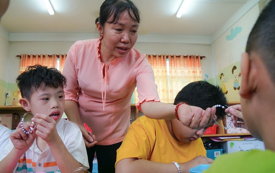 Chúng tôi đến Trường chuyên biệt Bình Minh (quận Tân Phú) vào một giờ học kỹ năng, cô giáo Đinh Thị Lan đang tỉ mẩn dạy học trò cách xỏ hạt nhựa vào xâu chuỗi. Lớp học chỉ với 12 học sinh nhưng những tiếng gọi “cô ơi” vang lên liên tục, khiến cô Lan không một phút ngơi nghỉ.